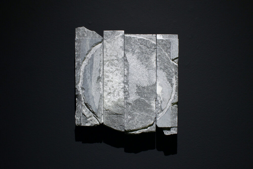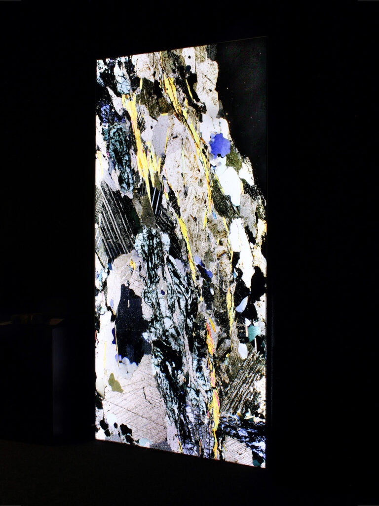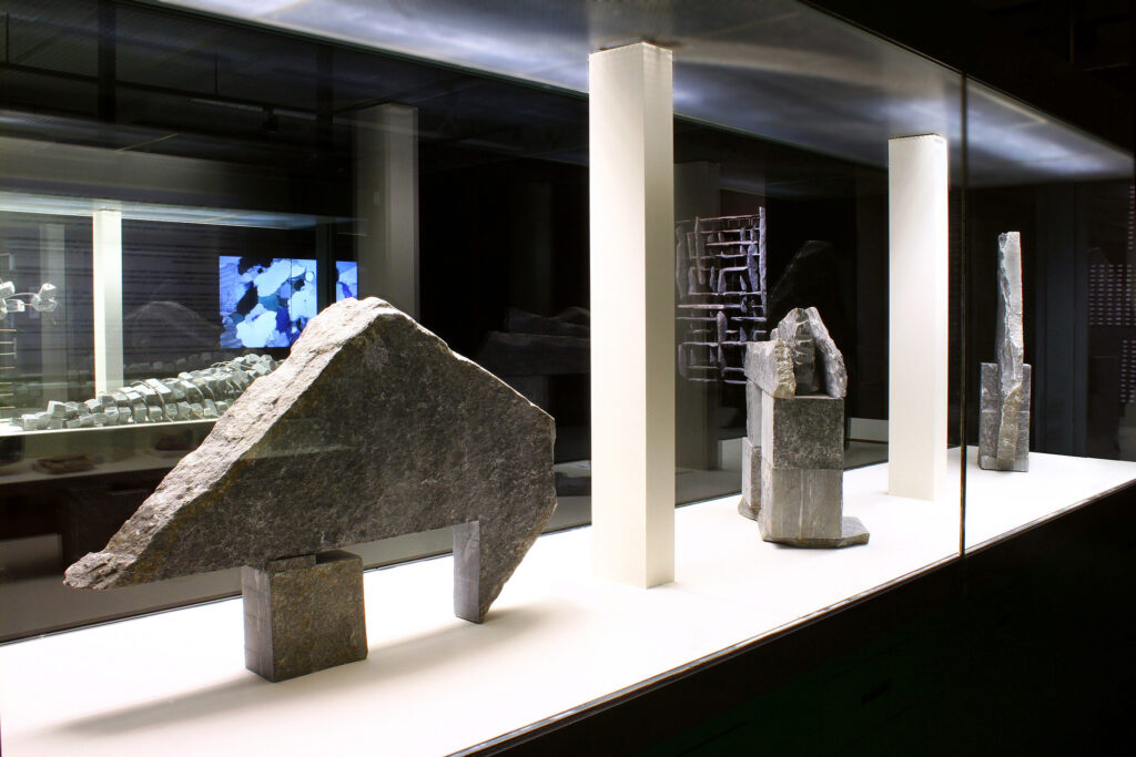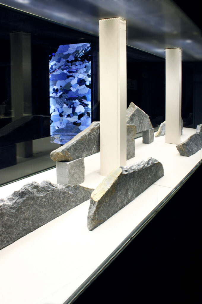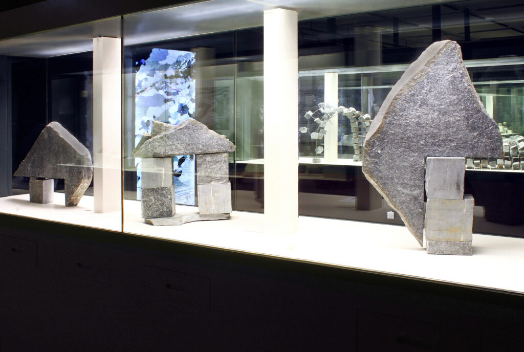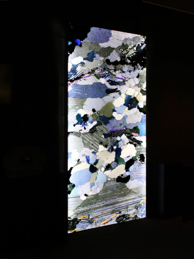 In seiner reinsten Form führt die Analyse des Gneis in den Bereich des feinstofflichen Aufbaus. Im Gesteinsdünnschliff, der mit dem Polarisationsmikroskop untersucht wird, lassen sich ungeahnte Welten schwereloser Schönheit entdecken, die sonst für das Auge verborgen sind. Axel Feuss, der die Einführung zur Ausstellungspublikation geschrieben hat, fasst zusammen: „Präzise bildhauerische Arbeit kontrastiert zur Rauheit des Materials, konkrete geometrische Form zur Bewegtheit des räumlichen Konzepts. Das ist kein Widerspruch in sich, sondern Mehrschichtigkeit der an der Natur und am künstlerischen Können erprobten Erfahrung.“